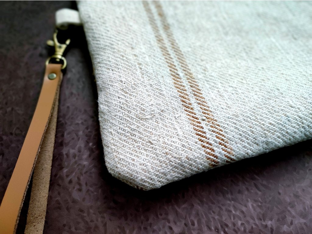 Antik zsákvászonból készült, karakteres darab, amely megőrzi a régi anyagok természetes szépségét. A karamell csíkozás finom kontrasztot ad a vászonnak, így ez a neszeszer egyszerre rusztikus és letisztult megjelenésű.