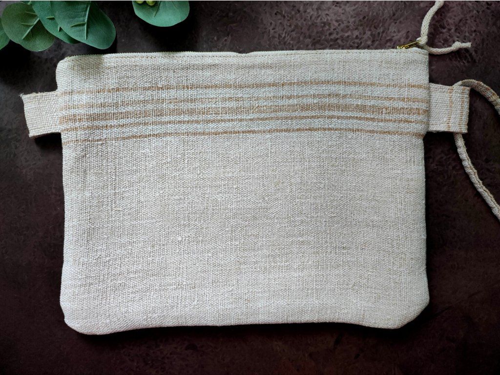 Anyagok: tiszta kender zsákvászon külső, antik lenvászon bélés, fém húzózár, pamut zsinór csuklópánt, közbélés nélkül, teljesen zero waste kialakítás, 1 db belső zseb