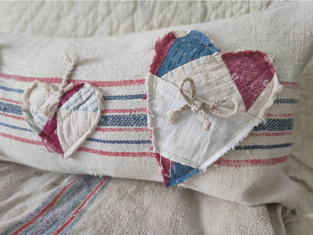 A szívek alapja eredeti vintage amerikai patchwork munka, amely régi csipkével és vászonnal egészült ki, így igazán egyedi és karakteres megjelenést kapott. A párnahuzat régi, kopottas kendervászonból készült, amelyen a korából adódó apró foltok az autentikus, rusztikus bájt erősítik.