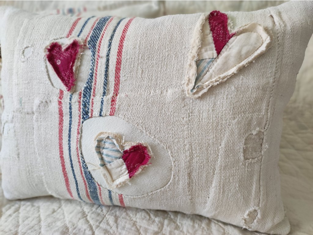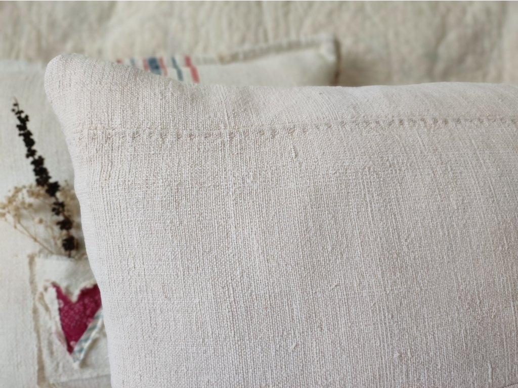 A párna középpontja egy eredeti, régi amerikai patchwork kézimunka, amelyhez gondosan válogatott háziszőttes vásznak és autentikus, foltozott zsákvászon került felhasználásra. A huzaton található hat apró, eredeti foltozás a múlt apró történeteit őrzi – mindegyik egyedi nyom a régi idők textilművességéből, amely most új életet kapott ebben a párnában.