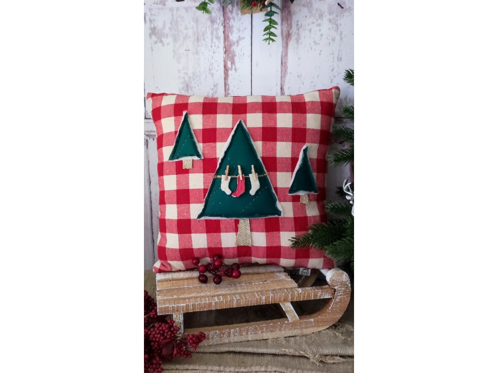 Rusztikus fenyőfás karácsonyi párna piros kockás vászonnal