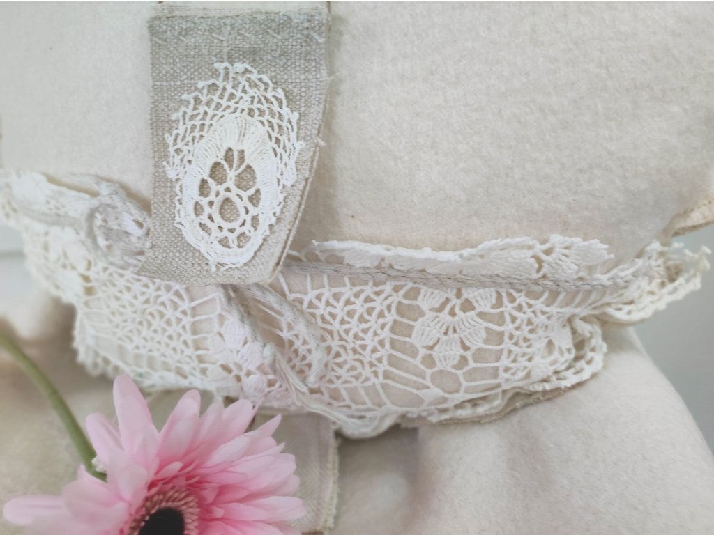 Az eleje 100% új főzött gyapjúból készült, antik vászon és régi csipke felhasználásával. Hátoldala antik lenvászon. A párna külön belső párnabetét nélkül készült, antiallergén poliészter töltettel.