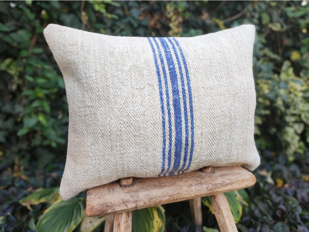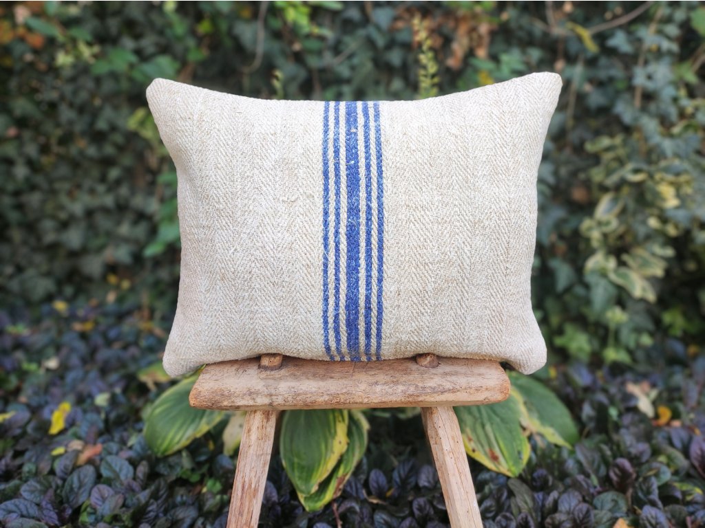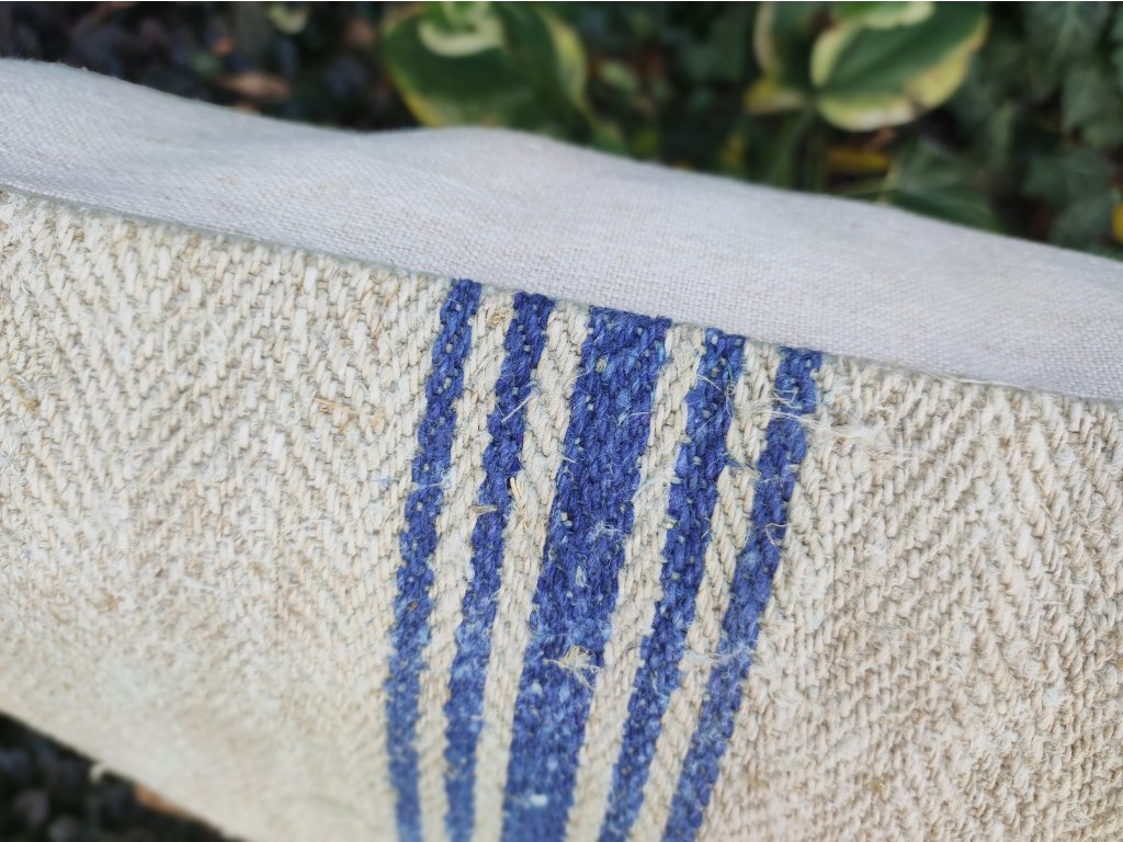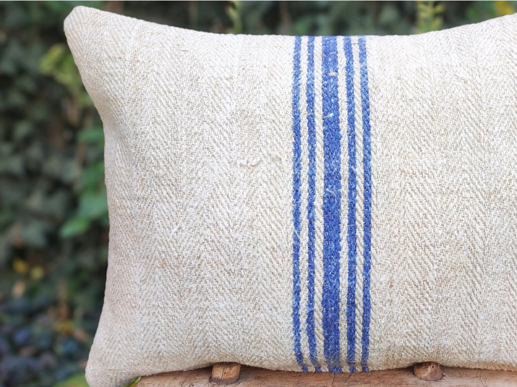 A középkék csíkozás finoman idézi a régi paraszti textíliák hangulatát, miközben a hátsó panel régi lenvászonból készült, hogy minden részlete természetes és időtálló legyen.