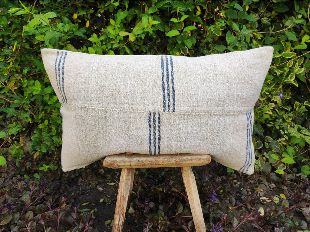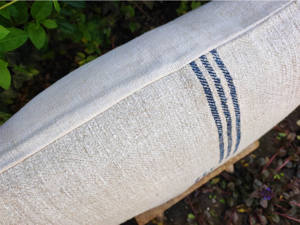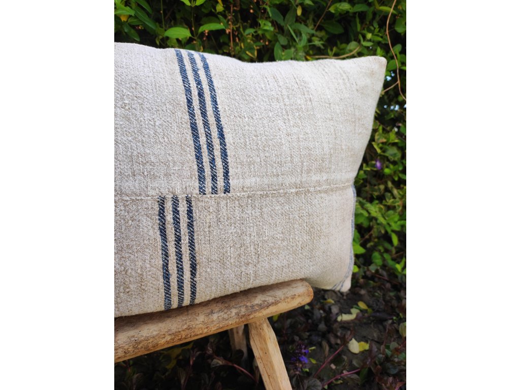 Egyedi, hangulatos, farmhouse–vidéki stílusú párnahuzat, mely autentikus, természetközeli karaktert visz otthonodba. Elöl erős szövésű, indigókék csíkos zsákvászon kapott helyet, amely strapabíró és rusztikus megjelenésű. A hátoldal antik lenvászonból készült, így a huzat különösen egyedi, időtálló és természetes textúrákkal gazdagított darab. Csak egy darab készült belőle.