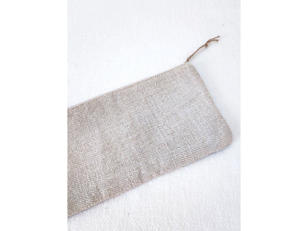 A lapos kialakítású kozmetikai táska külső része karakteres csíkos zsákvászonból készült, belseje régi len–pamut bélést kapott, amely tartósságot és autentikus hangulatot biztosít. A bézs cipzár letisztult megjelenést ad, közepes méretéhez zsebek nélküli belső társul, így könnyen átlátható és egyszerűen pakolható.