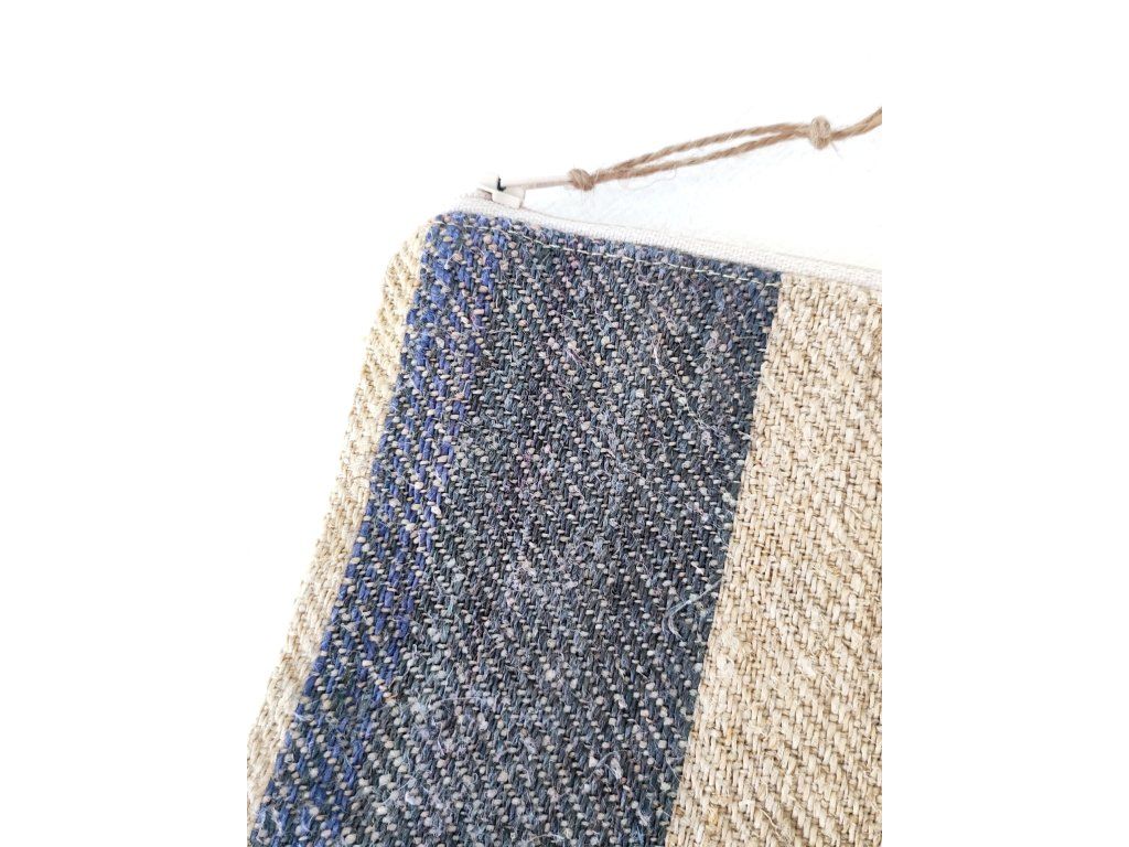 Kék csíkos zsákvászon pipere táska, mely természetes, rusztikus megjelenése időtálló stílust képvisel, miközben utazáshoz és mindennapi használatra is ideális.