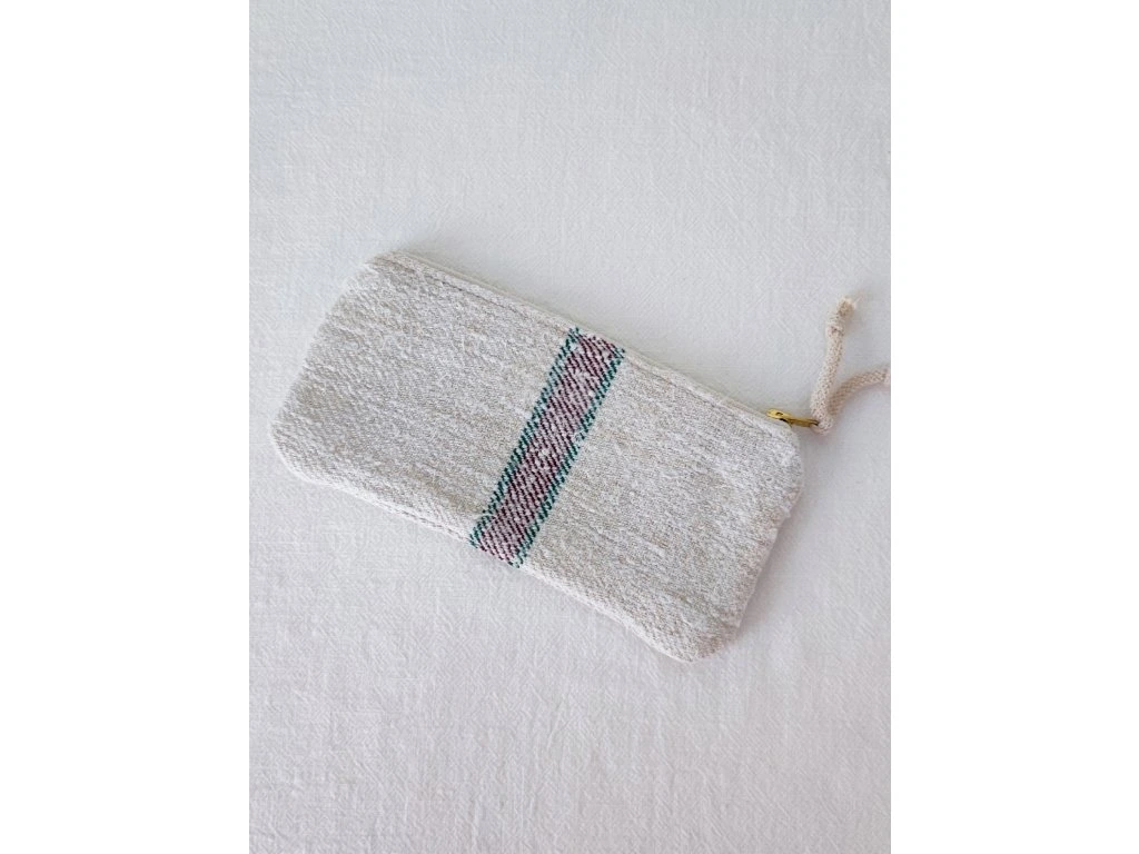 Csíkos vászon pipere táska természetes zsákvászonból, mely praktikus és sokoldalú megoldást kínál mindennapi használatra vagy utazáshoz. A kozmetikai táska antik vásznak kombinációjából készült, puha, vastag külső anyagból, mélybordó és zöld csíkozással.