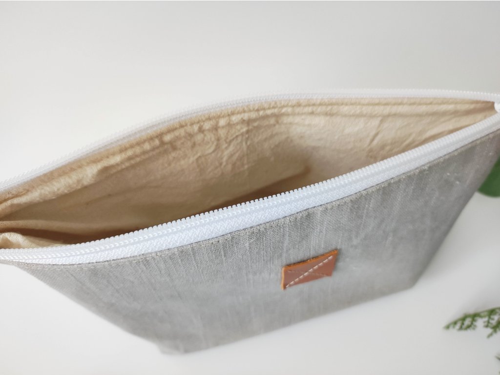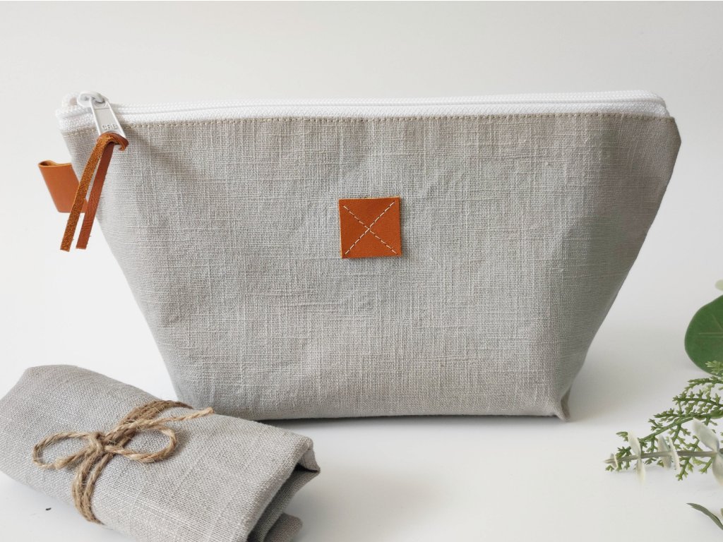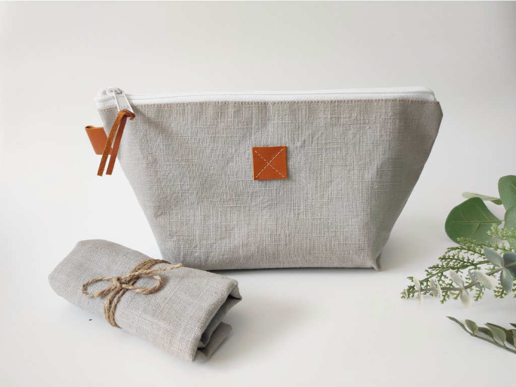 Talpas lenvászon kozmetikai táska - szürke kéztörlővel