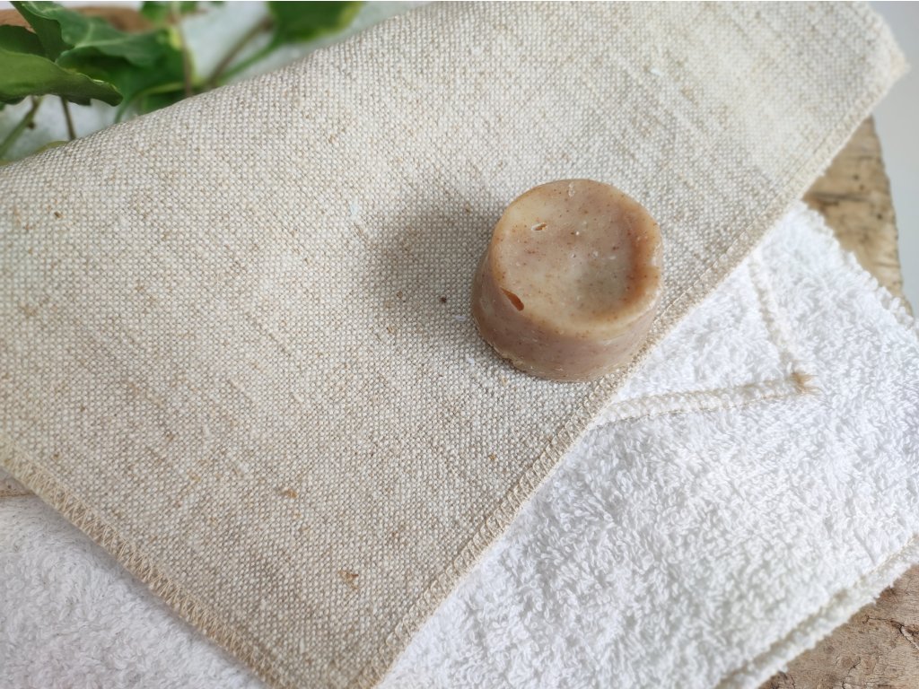 Anyagok: egyik oldalon enyhén radírozó hatású régi lenvászon, másik oldalon puha, 100% pamut frottír fehér színben