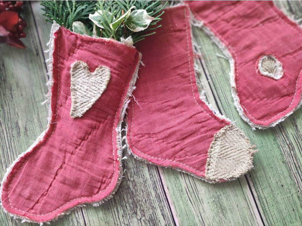 Ez a kis, kézzel készült piros zokniszett a egyszerűség és a vintage báj egyedi keveréke. Gyönyörű, régi természetes anyagokból készült, és a steppelt textúrája otthonos hangulatot teremt az ünnepi ünneplés során. Tökéletesen mutat a kandallópárkányon, fenyőfán, egy kosár szélén vagy egy ünnepi asztaldísz részeként. Ezek a kis zoknik valóban egyedi módon járulnak hozzá az ünnepi hangulat megteremtéséhez. Bármilyen rusztikus hangulatú otthon vagy vintage stílusú dekoráció tökéletes kiegészítői lesznek.