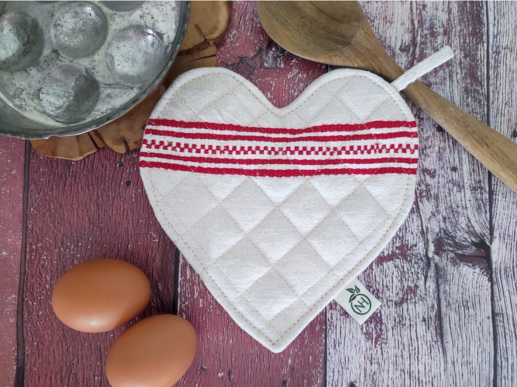 Autentikus hangulatú, kézzel készült edényfogó, amely régi szőttes vászonból született. A piros mintás anyag és a természetes textúra igazi vidéki bájt csempész a konyhába. Praktikus, mégis dekoratív kiegészítő, ami remekül illik a country, farmhouse vagy vintage stílusú otthonokhoz. A szív forma különlegessége a meleg, szeretetteljes otthonok hangulatát idézi, és kedves részletévé válik a konyhának – akár saját használatra, akár ajándéknak is tökéletes választás.