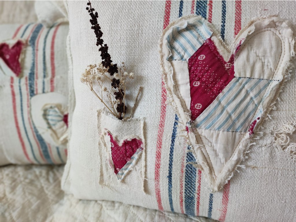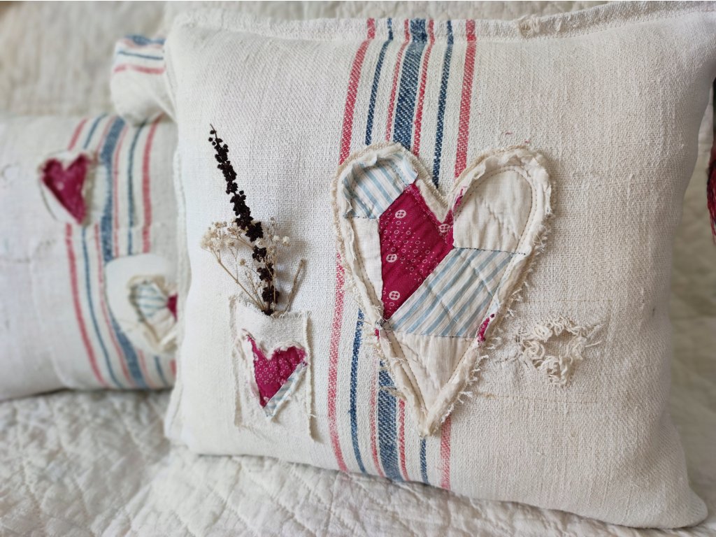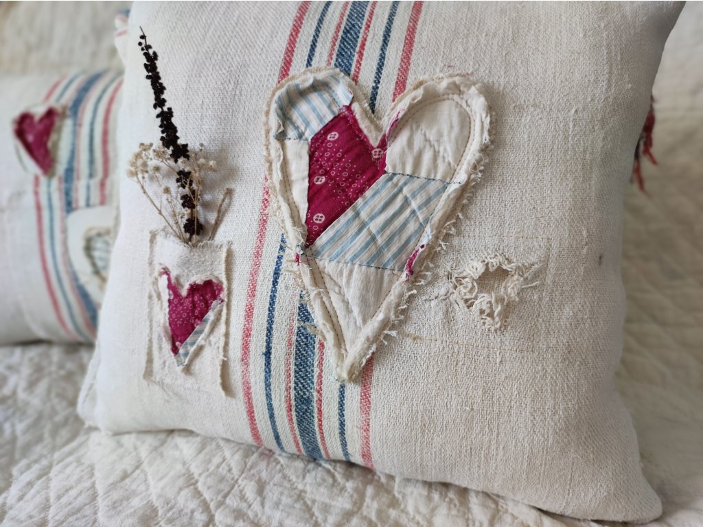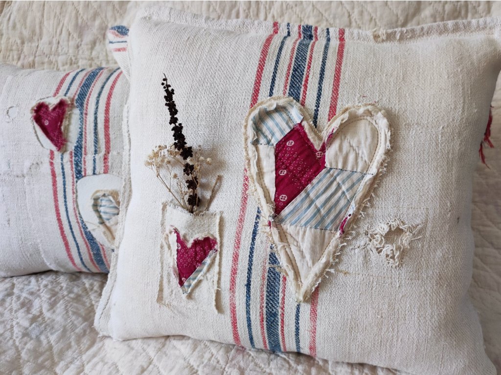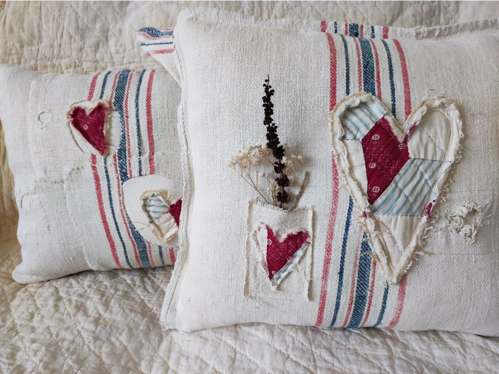 Egy igazi, egyedi darab a vidéki romantika és a farmhouse stílus kedvelőinek. A párna szíve régi, eredeti amerikai patchwork kézimunka, amelyet háziszőttes vásznakkal és foltozott zsákvászonnal egészítettem ki.