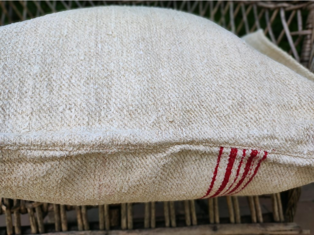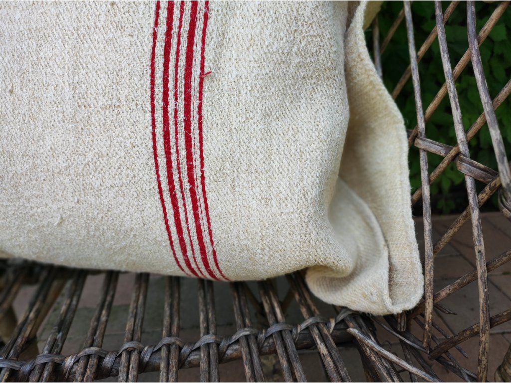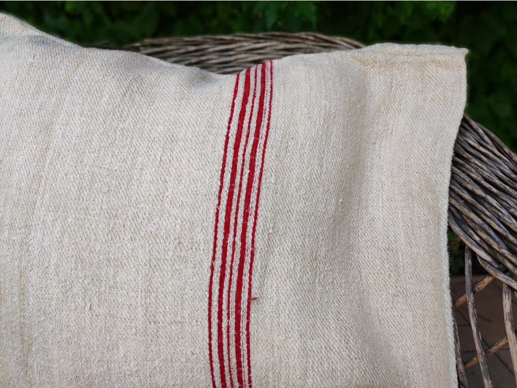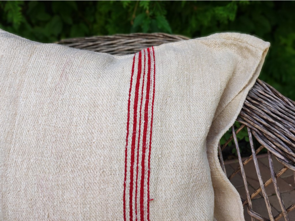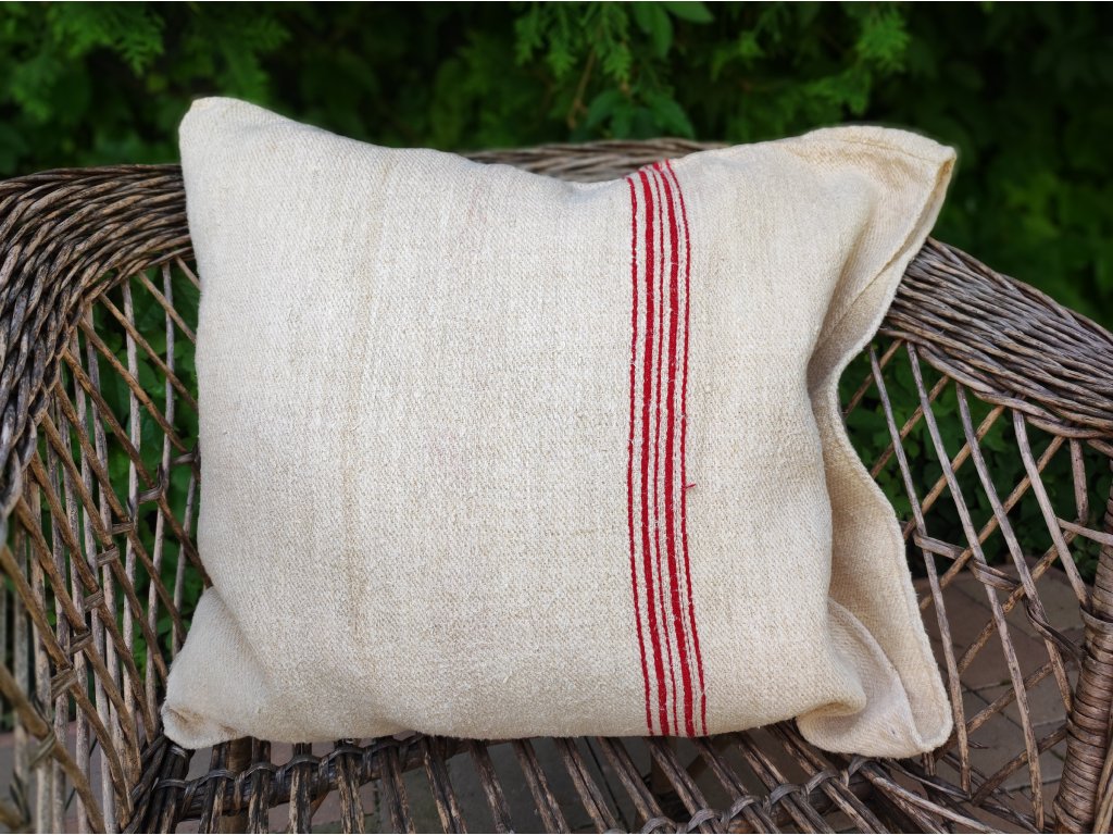Egy valódi, történettel rendelkező antik zsákvászon kel életre ebben a különleges, rusztikus párnahuzatban, mely kisebb zsákként szolgált valaha. Éppen ezért a múlt nyomai finoman jelen vannak rajta, mégis strapabíró és erőteljes textúrájú. A vastag, tömör szövésű kendervásznat cseresznyepiros csíkozással szőtték, amely a régi idők kézműves textiljeinek hangulatát idézi.