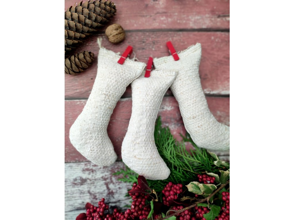Az akasztót a kis csizmák hátulján rögzítsd a csipesszel. Így fenyőfadíszként és asztali dekorként is használhatod.