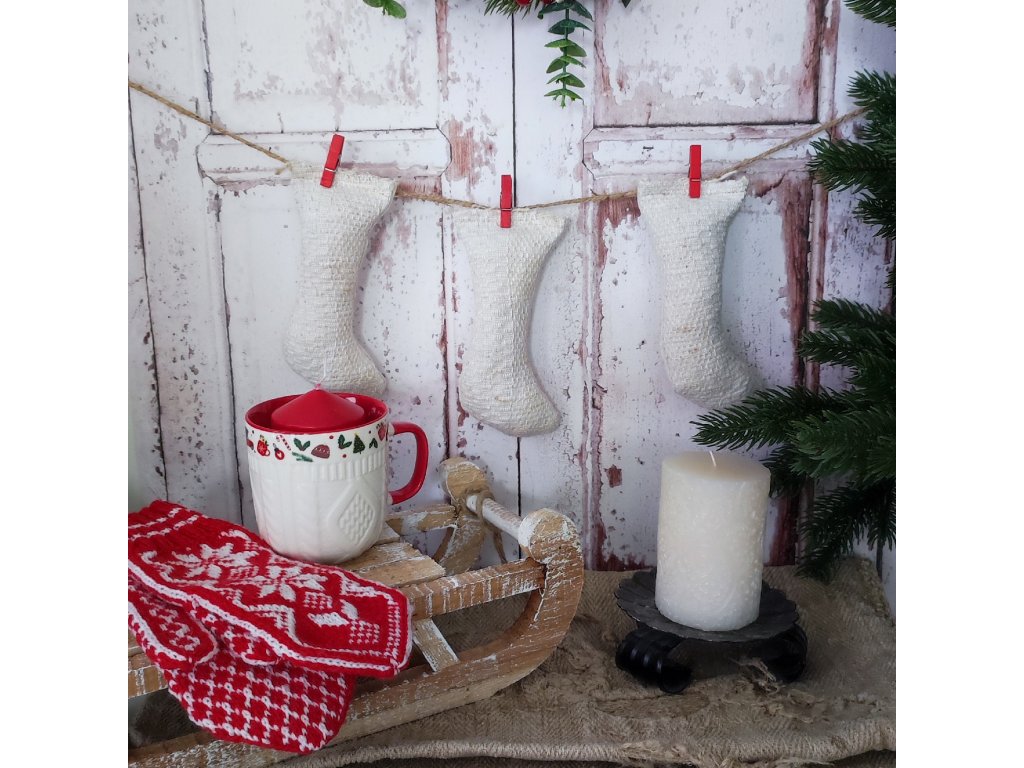 Ez a háromdarabos vintage Mikulás csizma szett különleges kendervászonból készült, antiallergén poliészter töltettel, így könnyű, mégis tartós és formás kis dekoráció. A rusztikus textúrák és a vintage hangulat miatt tökéletesen illik a farmhouse, cottage vagy természetes karácsonyi stílusba.