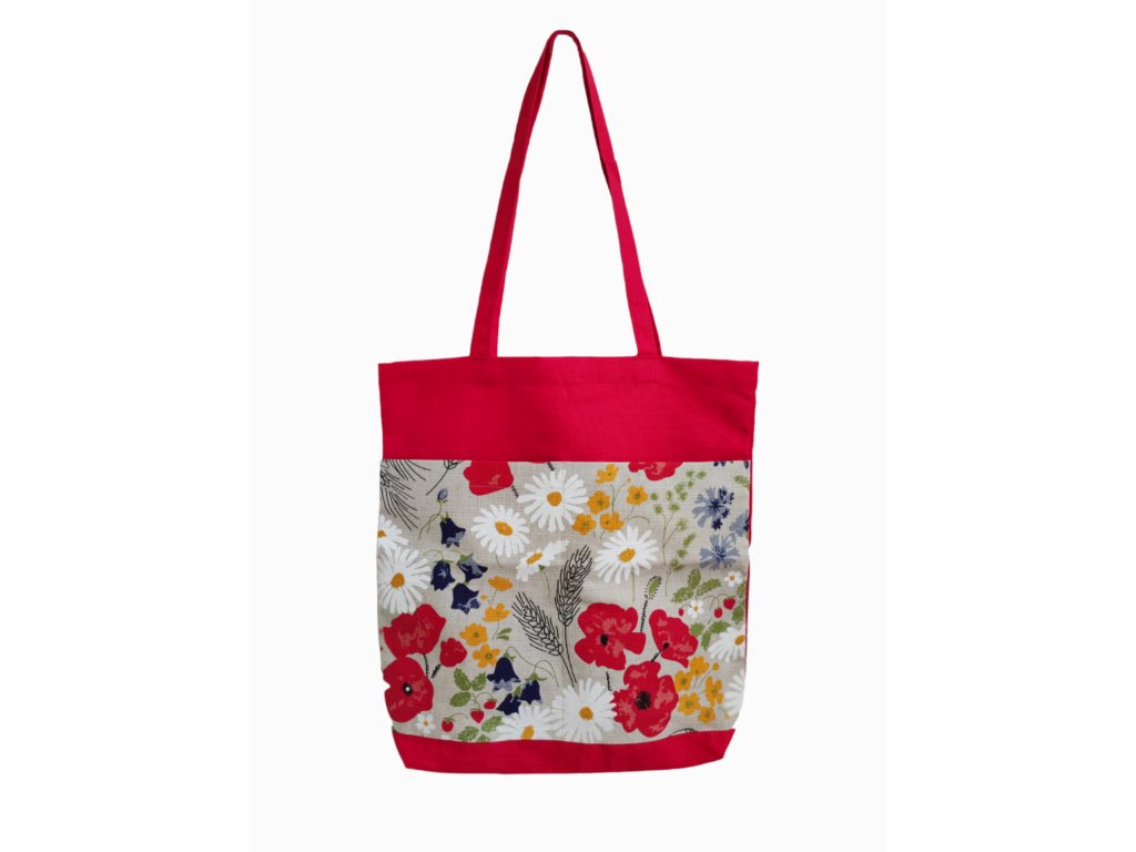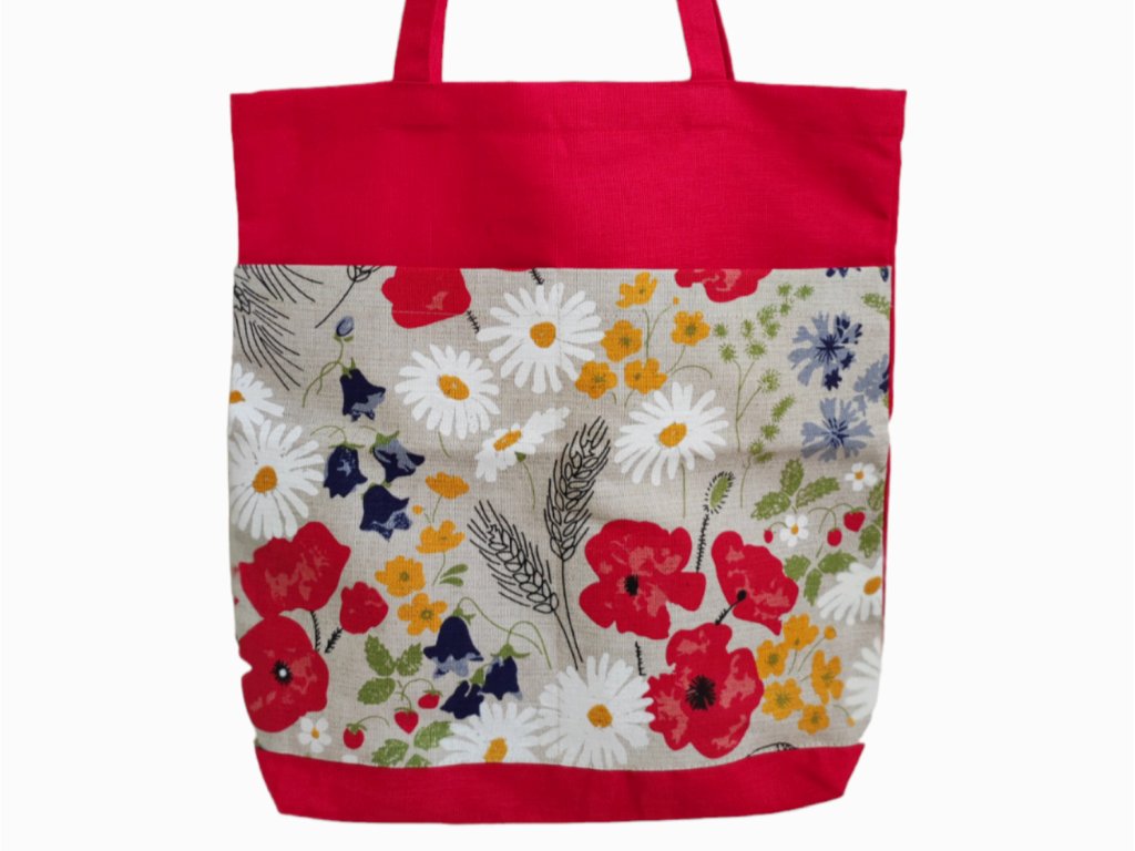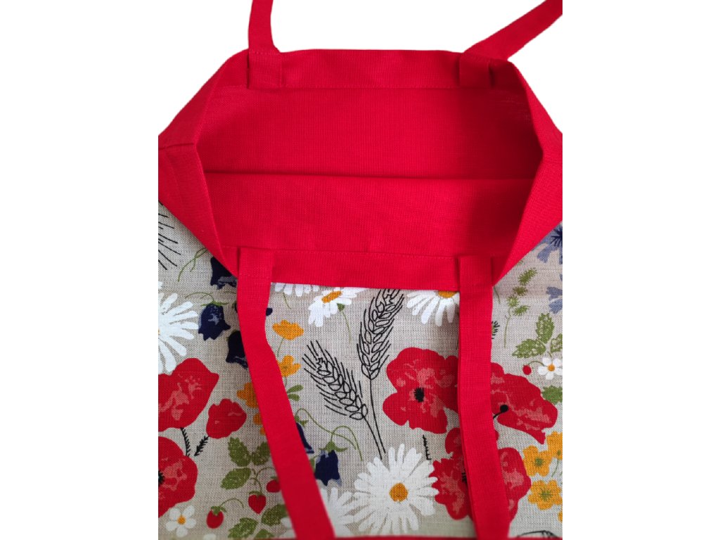Pipacsos, virágmintás len–pamut pakolós táska élénk színekkel és vidám megjelenéssel.